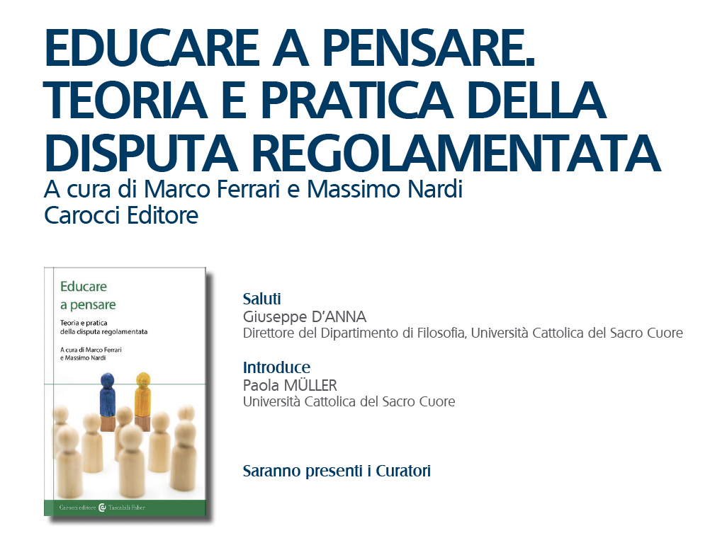 Siete tutti invitati a partecipare all’evento di lancio del torneo, che si terrà in occasione della presentazione del volume Educare a pensare. Teoria e pratica della disputa regolamentata (Carocci, 2025) a cura di Marco Ferrari e Massimo Nardi. L’evento si svolgerà venerdì 17 ottobre dalle ore 15:30 presso l’Università Cattolica di Milano (Largo Gemelli, 1 – Aula G.252) e in diretta streaming.
